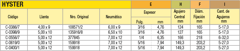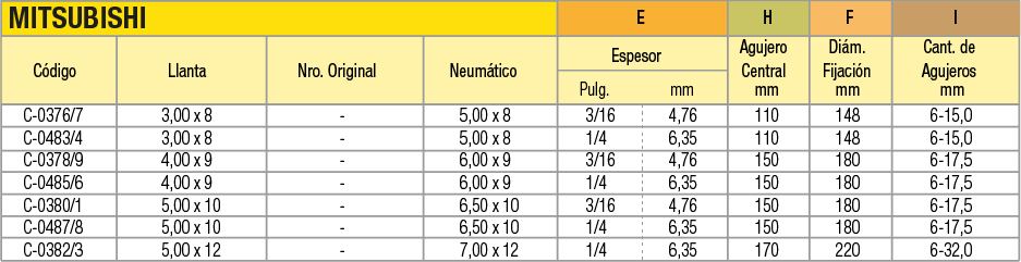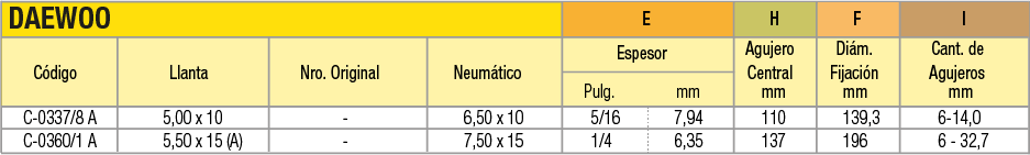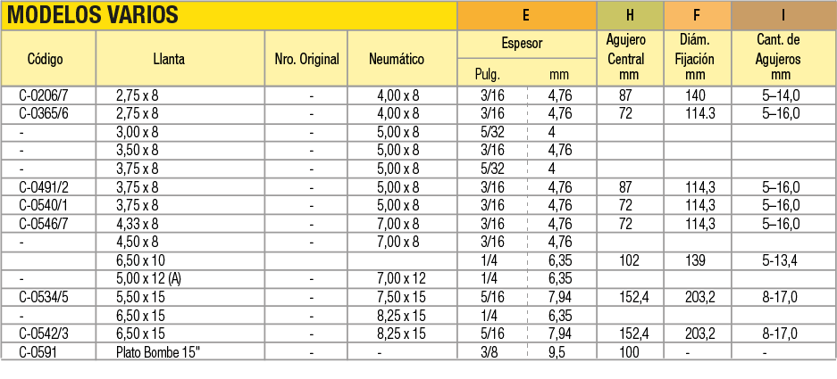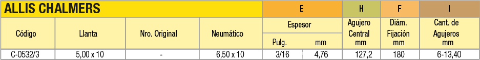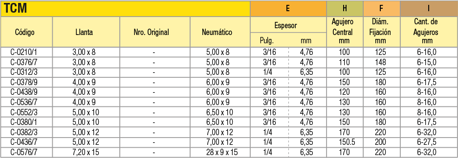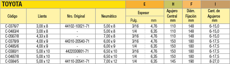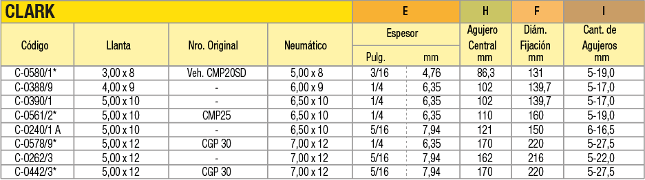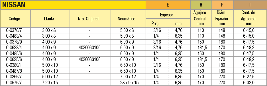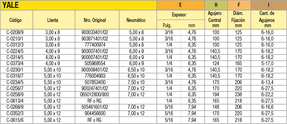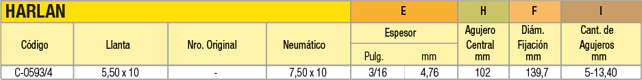Llantas OEM (Original Equipment Manufacturer) en acero estampado en dos mitades unidas por tornillos para cubiertas macizas o neumáticas indistintamente. La línea de productos abarca desde 4 pulgadas a 16 pulgadas de diámetro. Pueden utilizarse en autoelevadores, vehículos industriales de movimiento de materiales, carretones y vehículos agrícolas.